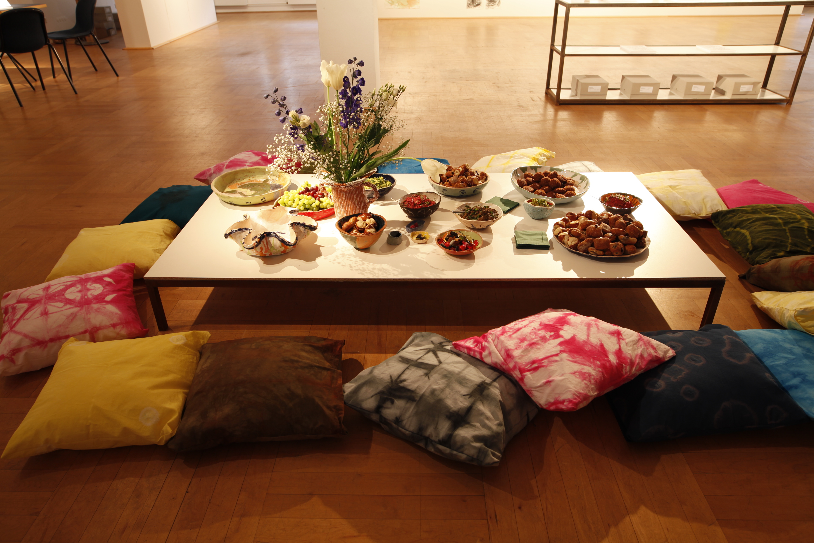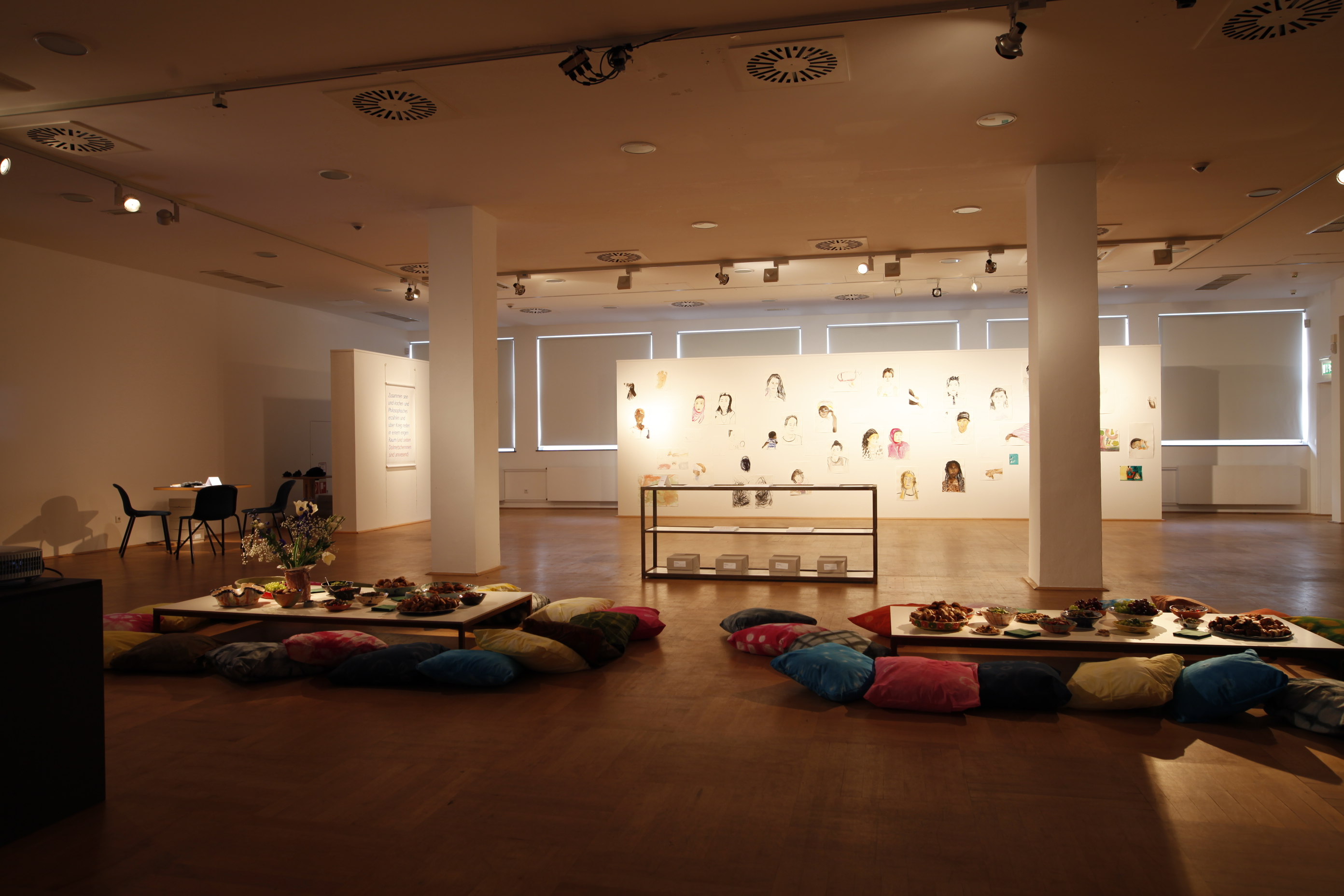 Circle of Looks by Adwoa Adjei, Carol Pilars de Pilar, Thyra Schmidt and Anne Schülke showed autobiographical texts and images from the summer of 2018: drawings, watercolors, an artist's book, an experimental video and a project documentation. The material was created in collaboration with women from Bangladesh, Germany, Ghana, Iran, Morocco, Pakistan, Romania, Somalia and Chechnya.