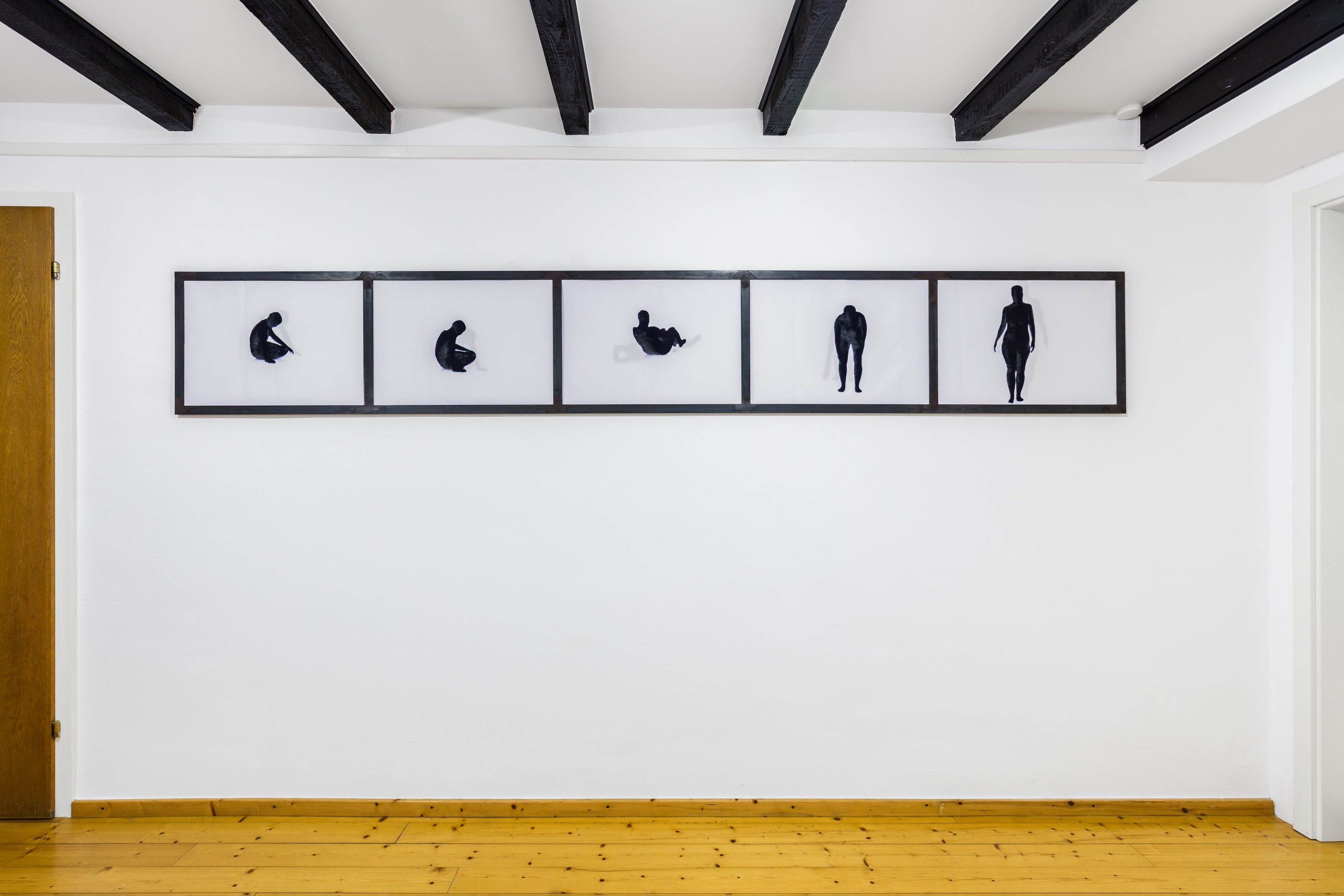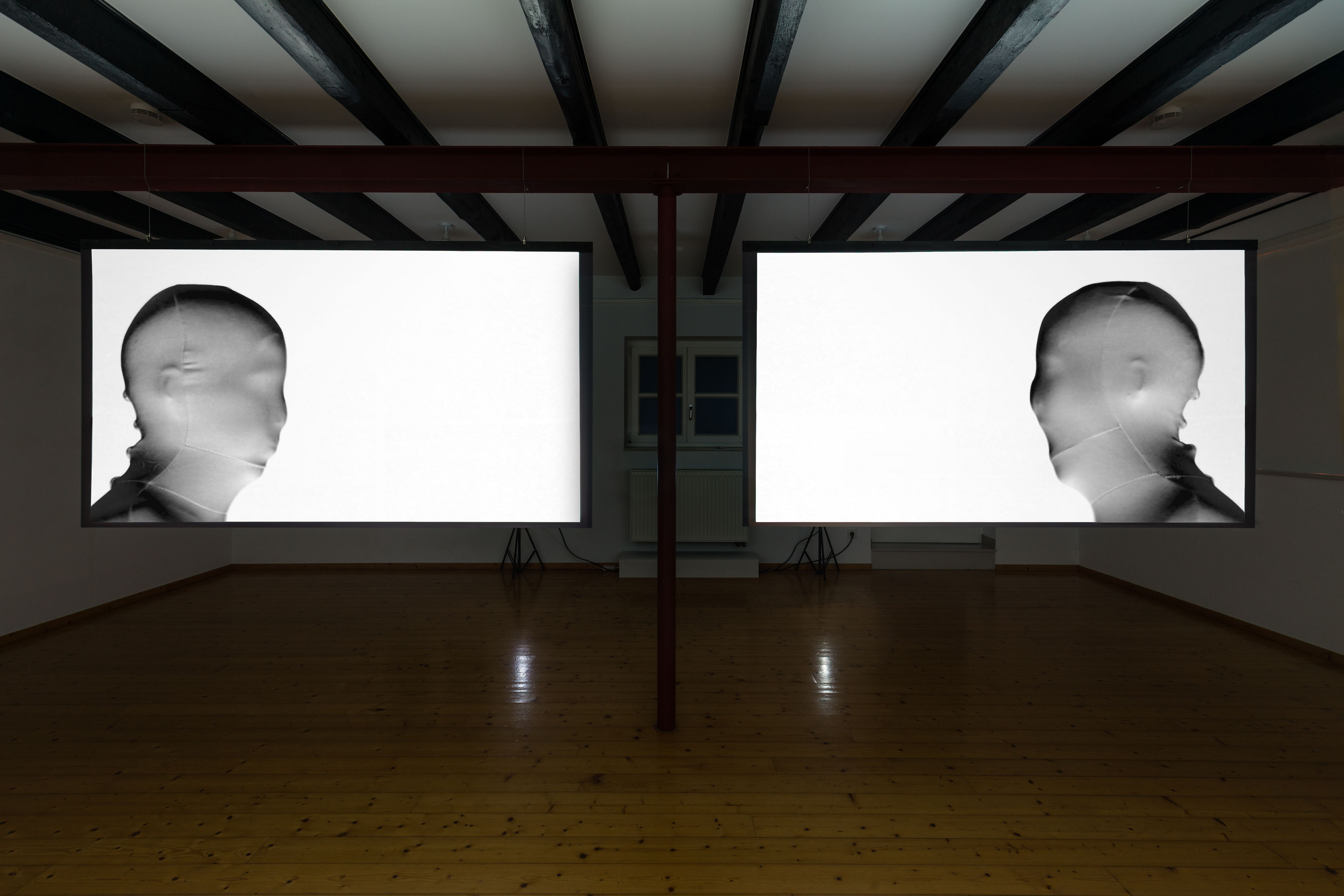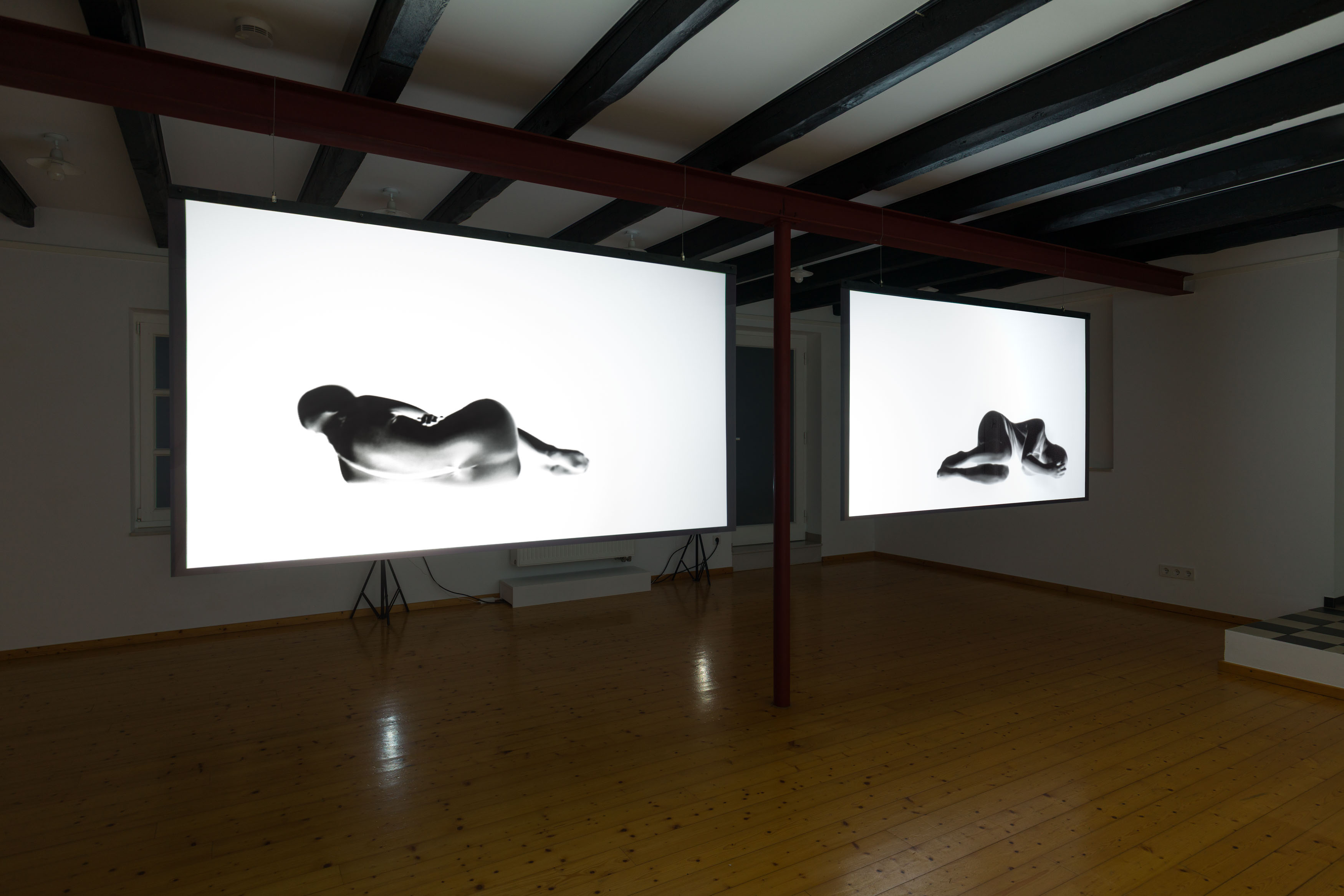 The central video installation, also titled “Likeness”, consists of two Plexiglas panels onto which videos are projected. The works show me performing movements in a studio, wearing a full-body suit and repeating each action twice, creating a subtle interplay between sameness and variation. I revisit and develop movements from earlier works such as White Balance and Subcooled.
