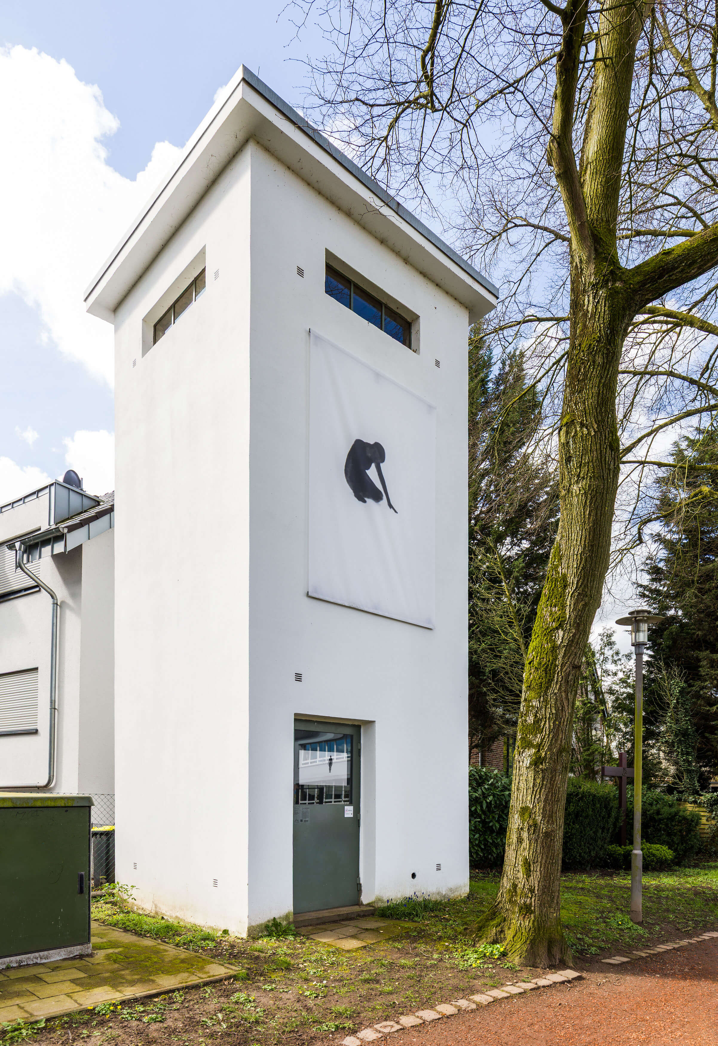 Über die Räume des Projektraums hinaus setzt sich die Ausstellung im Außenraum fort: In der Nähe des Projektraums, in einem alten Trafoturm, hängt ein Monitor, auf dem das Video „White Balance (Einkanalversion)“ von 2024 läuft. Darüber ist ein großes Banner mit einem Bild aus dem Video angebracht.