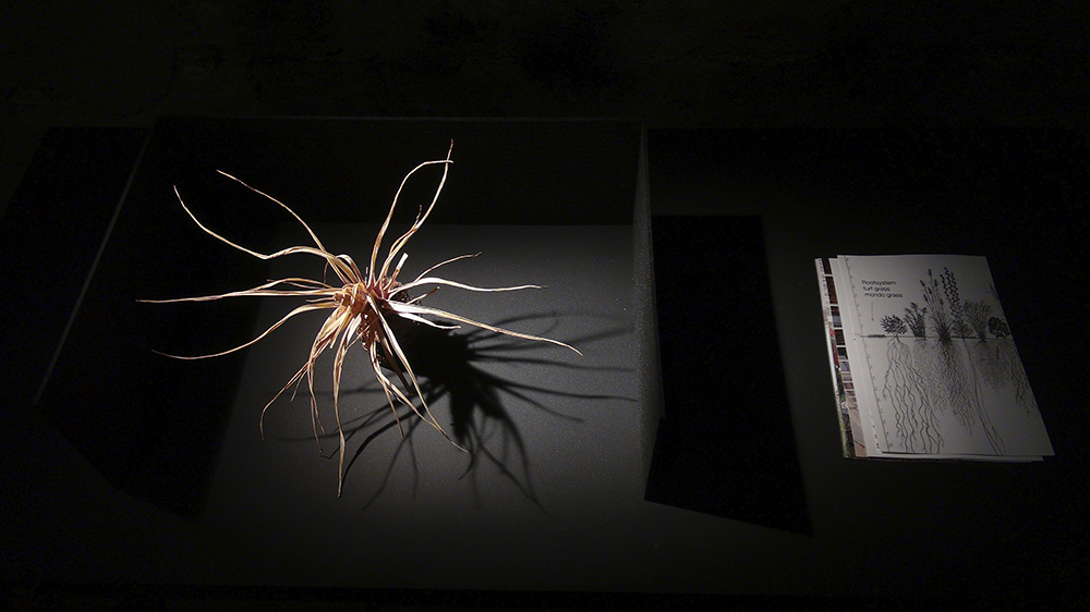 Mondo Grass consists of an object scan (70x100 cm), a collection of materials (steel frame 82x37x86 cm) and a video (HDV, loop 3'33). The object scan was mounted on a tripod and illuminated with a dedolight. The material collection consisted of the plant and a protection made of wood fiber boards as well as a collection of photographs and found footage from internet research. The frame was illuminated by a dedolight. The video was played via a laptop. The laptop stood in a wooden box. This box stood on a steel frame. Headphones were lying on the wooden box.