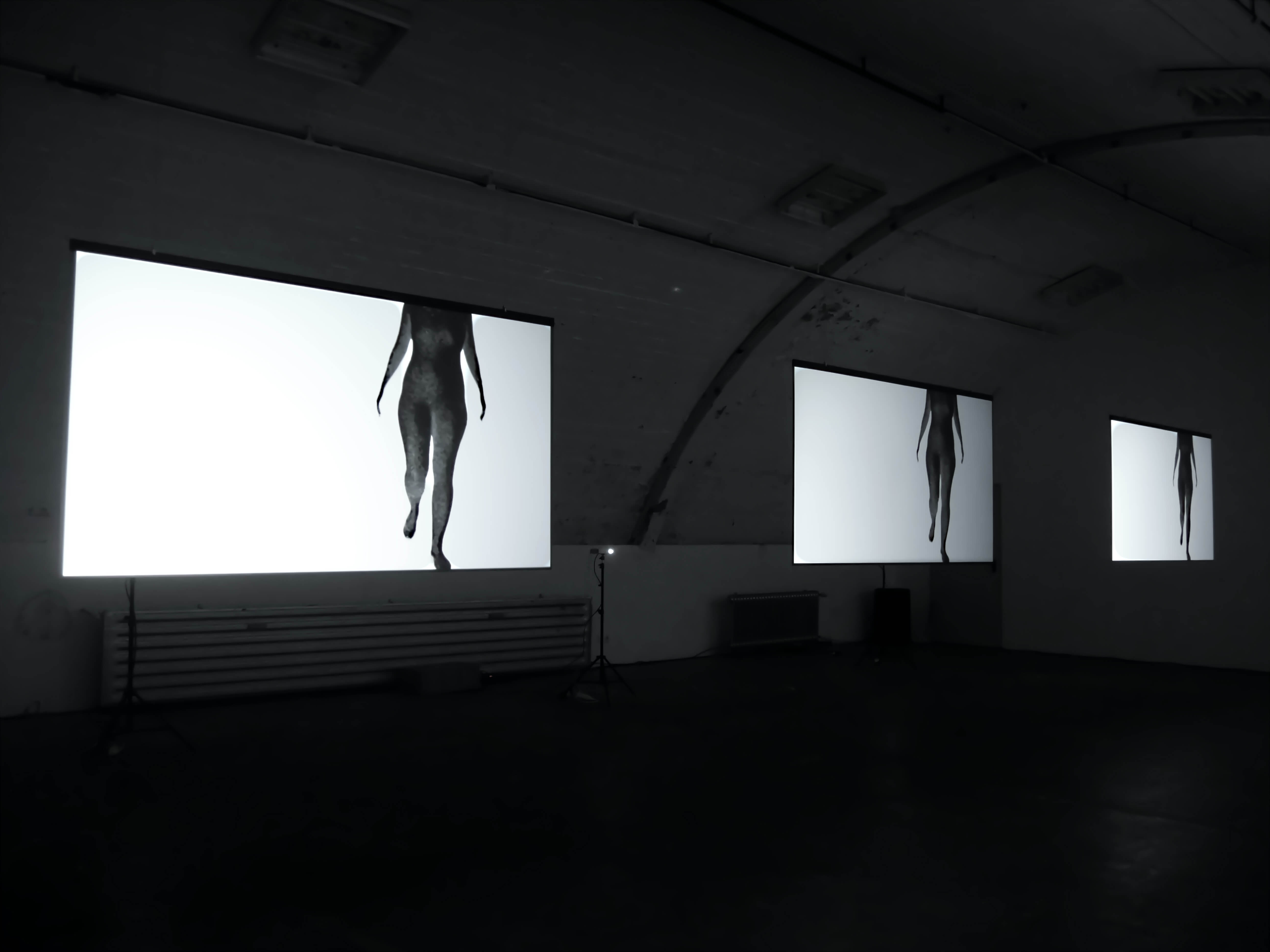 White Balance is a three-channel video installation based on a performance. I move through a room in a full-body suit in front of a video camera without any predetermined sequences. The room has white walls and a light grey floor. The camera's aperture is wide open so that the boundaries of the room are not clearly recognisable. A single undefined body can be seen in an undefined space. An audio work becomes accessible via headphones: slightly distorted sounds of joint movements and breathing in the room as well as sounds from outside can be heard.