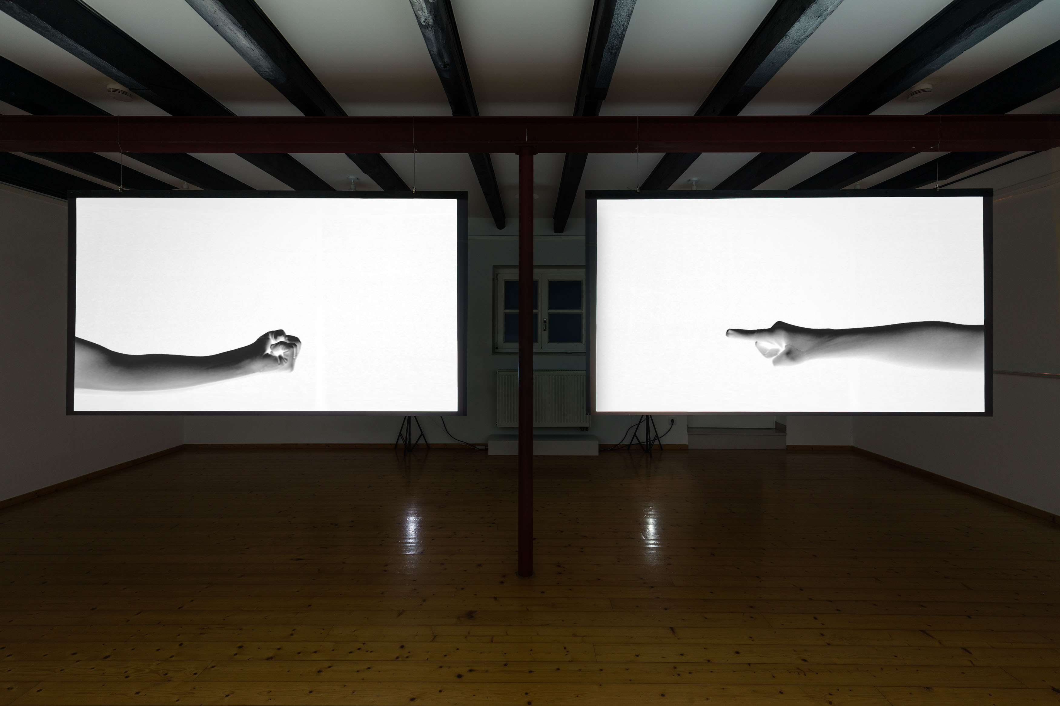 The central video installation, also titled “Likeness”, consists of two Plexiglas panels onto which videos are projected. The works show me performing movements in a studio, wearing a full-body suit and repeating each action twice, creating a subtle interplay between sameness and variation. I revisit and develop movements from earlier works such as White Balance and Subcooled.