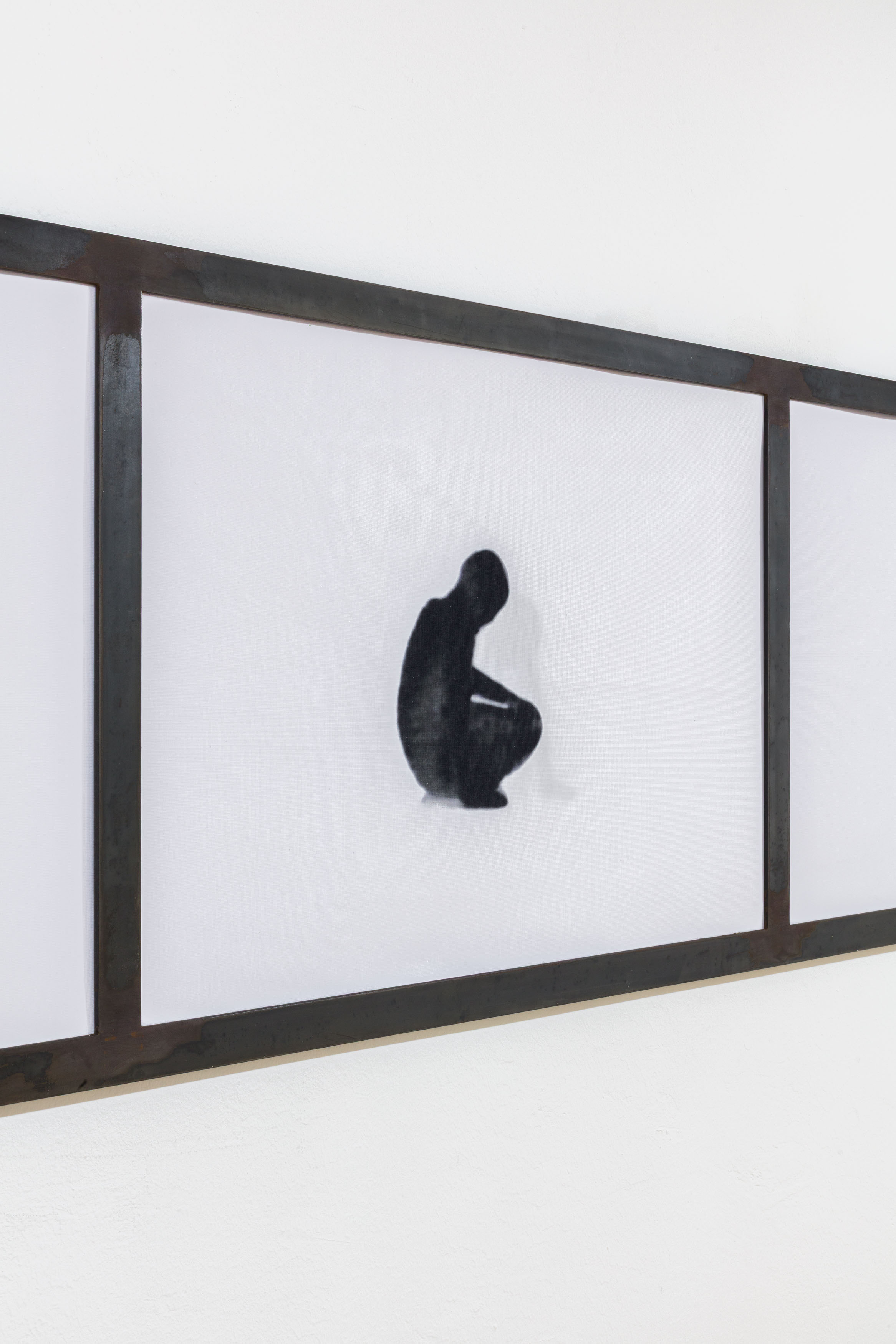 The second work, “White Balance (wall object)”, extends this enquiry into material form. Fabric pieces depicting bodies are layered within a steel frame and held in place by magnets. The overlapping layers allow underlying images to show through, suggesting both visual and symbolic superimposition—what is visible points to what remains unseen, hinting at a body in constant flux.
