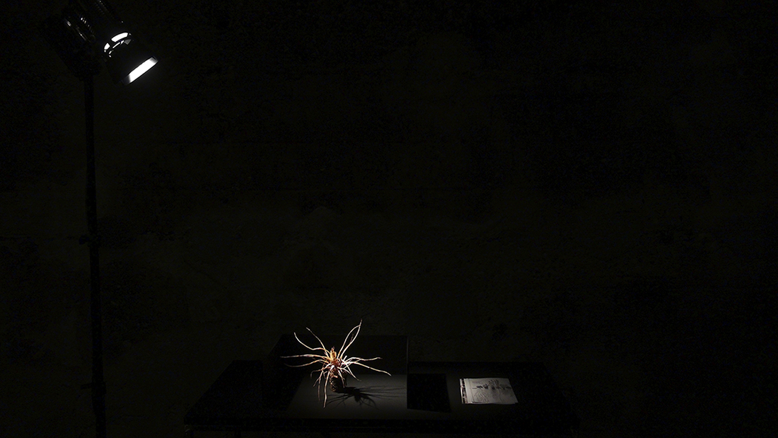Mondo Grass consists of an object scan (70x100 cm), a collection of materials (steel frame 82x37x86 cm) and a video (HDV, loop 3'33). The object scan was mounted on a tripod and illuminated with a dedolight. The material collection consisted of the plant and a protection made of wood fiber boards as well as a collection of photographs and found footage from internet research. The frame was illuminated by a dedolight. The video was played via a laptop. The laptop stood in a wooden box. This box stood on a steel frame. Headphones were lying on the wooden box.